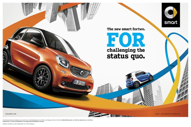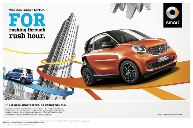 Mit der Markteinführung der neuen smart Generation am 22. November 2014 startet die neue Ära in der Geschichte der Marke smart auch auf den Straßen und in den Städten. Bereits die internationale Markenkampagne FOR zeigte auf emotionale Art und Weise, wie sich die Marke vom Wettbewerb abhebt: smart verkörpert die Haltung, FÜR etwas zu sein, und sorgt für mehr Lebensfreude in der Stadt. Diese Haltung setzt sich nun konsequent in den beiden Produktkampagnen fort. Die Kampagne zum smart fortwo positioniert das Fahrzeug als Einzigartig in der Stadt. Auch die Kampagne zum neuen smart forfour führt den Dachgedanken FOR weiter und beweist die Besonderheit des smart forfour als Der smart unter den Viersitzern. Die internationalen Kampagnen bespielen alle Kommunikationskanäle von Print über TV bis hin zu Online und Social Media.