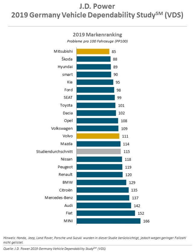 Die Gesamtzuverlässigkeit wird durch die Anzahl an auftretenden Problemen pro 100 Fahrzeugen ermittelt. Die ersten 11 Plätze bei der Fahrzeugzuverlässigkeit gehen an Volumenmarken, wobei Mitsubishi bezüglich der Gesamtzuverlässigkeit des Fahrzeugs am besten abschneidet.Volvo erzielt innerhalb der Premiummarken das beste Ergebnis, belegt aber insgesamt nur Platz 12. Die deutschen Premiummarken BMW, Mercedes-Benz und Audi belegen Platz 17, 19 und 21. Ganz sieglos blieb Mercedes-Benz Cars bei der J.D. Power Studie aber nicht. In den einzelen Segmenten gab es sogar zwei erste Plätze für Daimler-Produkte: So wurde zum besten Kleinstwagen der smart fortwo gekürt. Und in der Oberklasse kam die Mercedes E-Klasse auf den ersten Rang.
