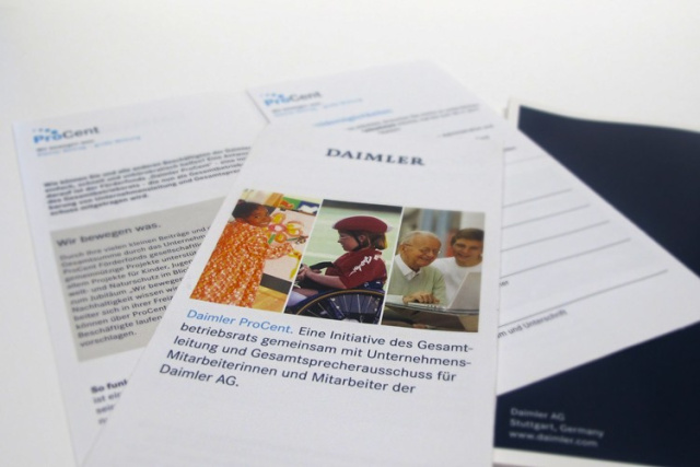 Einfach, schnell und unbürokratisch helfen. Das ist die Idee, die hinter Daimler ProCent steckt. Und genau dies wird jetzt mit den ersten ProCent Projekten umgesetzt.Die Daimler-Beschäftigten haben seit Dezember 2011 die Möglichkeit, den Cent-Betrag ihrer monatlichen Netto-Entgeltauszahlung zu spenden und jeder gespendete Cent wird vom Unternehmen verdoppelt. Die Spenden sollen gesellschaftlich relevante und gleichzeitig gemeinnützige Projekte im In- und Ausland unterstützen. Vorschläge für förderungswürdige Initiativen können jederzeit von den Beschäftigten der Daimler AG bei den ProCent Koordinatioren der einzelnen Standorte eingereicht werden. Nun laufen die ersten eingereichten gemeinnützigen Projekte an. Diese zielen darauf ab, direkte Hilfe für Kinder, Jugendliche und Behinderte anzubieten.