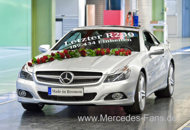 Der letzte Mercedes-Benz SL der aktuellen Baureihe, intern R 230 genannt, lief am 30. November im Werk Bremen vom Band. Der iridiumsilberne SL 350 mit Sportpaket wird künftig im Mercedes-Benz Museum ausgestellt. Wir sind stolz, dass der SL eine Sportwagen-Ikone von Mercedes-Benz mit Bremer Herz von unseren Kunden so gut angenommen wurde und Geschichte geschrieben hat, sagte Andreas Kellermann, Leiter des Mercedes-Benz Werks Bremen. Diese Baureihe war ein Trendsetter. Auch die neue Generation wird die Geschichte des SL standesgemäß fortführen, so Kellermann weiter. Im März 2012 kommt der neue SL auf den Markt. Die neue Generation nimmt die Bedeutung des berühmten Kürzels SL sportlich leicht sehr ernst: Mit einem vollkommen aus Aluminium gefertigten Rohbau konnte das Gewicht gegenüber dem Vorgänger insgesamt um 140 Kilogramm verringert werden.