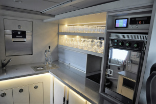 Für mehr Sicherheit sorgen unter anderem vier Kameras an Front, Heck und oberhalb der Seitenscheiben. Sie erfassen die Fahrzeugumgebung und erzeugen aus der Vogelperspektive eine indirekte Rundumsicht von 360°. Eine Umfeldbeleuchtung sorgt für ausreichend Licht beim Ein- und Ausstieg der Fahrgäste sowie beim Be- und Entladen des Kofferraums. Solarpanelen auf dem Dach dienen als eigenständige Energieerzeuger. Diese speisen einen zusätzlichen Energiespeicher, der es ermöglicht, sämtliche Küchengeräte über längere Zeit im Stand zu nutzen, ohne den Motor laufen zu lassen.