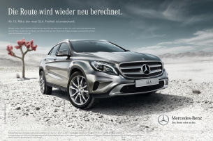 Der GLA ist ein Auto für alle, die die Welt nicht bloß entdecken, sondern erobern wollen. Dies setzen wir in unserer Kampagne zur Markteinführung um. Wir zeigen das Auto dort, wo es sich besonders wohlfühlt: in der Stadt und in der Wüste auf unbefestigtem Schotter in der gleißenden Mittagssonne. Wir sind überzeugt davon, dass der GLA eine ähnlich hohe Eroberungsquote wie unsere anderen Kompakten erreichen wird, erläutert Dr. Jens Thiemer,