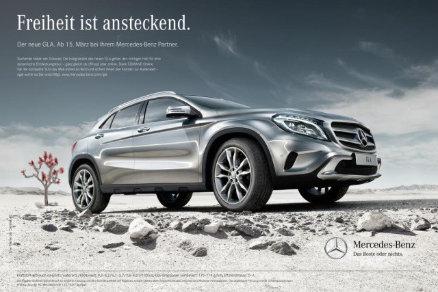 Der neue Mercedes-Benz GLA steht in den Startlöchern. Am 15. März ist Händlerpremiere für das Mercedes-SUV, das sich auch in der Werbekampagne, welche die Markteinführung begleitet von der taffen Seite zeigt. Raus aus den Zwängen?. Bock auf den eigenen Weg? Dem Drang nach Freiheit folgen? Gemäß der Devise Freiheit ist ansteckend will der Mercedes GLA der Weggefährte für alle Unangepassten mit Rückgrad sein.