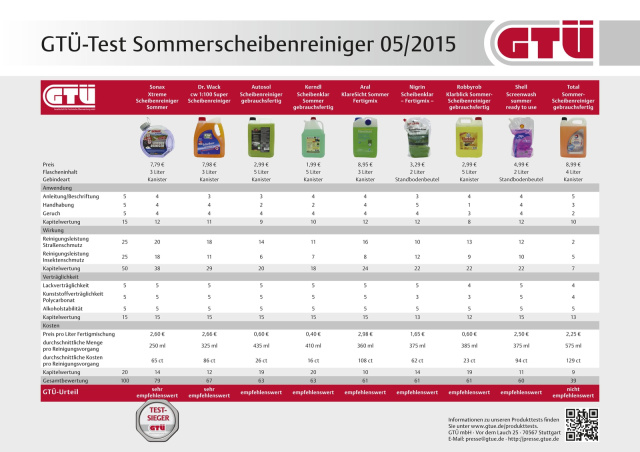 Die GTÜ Gesellschaft für Technische Überwachung hat neun aktuelle Sommerscheibenreiniger geprüft. Klarer Testsieger mit dem Prädikat „sehr empfehlenswert" wurde Sonax Xtreme Scheibenreiniger Sommer im Dreilitergebinde zum Preis von knapp acht Euro gefolgt vom ebenfalls als „sehr empfehlenswert" eingestuften und kaum teureren Dr.-Wack-Produkt CW 1:100 Super Scheibenreiniger Fertiggemisch (ebenfalls im 3-Liter-Kanister). Trotz seines leicht irreführenden Markennamens „CW 1:100" wird es wie alle anderen Testkandidaten für maximale Wirkung unverdünnt in den Waschbehälter eingefüllt.