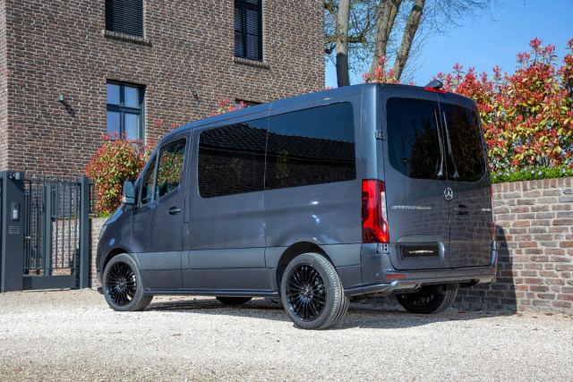 Aber: Auch diesem kurzen Sprinter, einem werksseitig luxuriös ausgestatteten Exemplar mit Hinterradantrieb und Vollluftfederung, stehen die SP Stream-AerodynamikKomponenten ausgezeichnet. Insbesondere gilt dies freilich in Kombination mit den ebenfalls VANSPORTS-hauseigenen VEST1-Leichtmetallrädern. Diese filigranen Doppelspeichen-20-Zöller rotieren hier in Glanzschwarz mit Continental Sport ContactBereifung in 255/45R20.