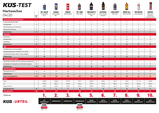 Testsieger mit dem KÜS-Prädikat "sehr empfehlenswert" ist das A1 Speed Wax Plus 3 von Dr. Wack, gefolgt von den "empfehlenswerten" Produkten Sonax Xtreme Brilliant Wax 1, Sonax AutoHartWax, RS 1000 Glanz-Wachs und Meguiar´s Ultimate Liquid Wax. Im Test lediglich "bedingt empfehlenswert" die Wachse Autosol Nano Protection Hartwachs, Liqui Moly Hartwachs, Armor All Speed Hard Wax. Schlusslichter und somit "nicht empfehlenswert" die ROTWEISS Lackversiegelung und Nigrin Performance Hartwachs-Lackschutz Turbo. Wer von einem Wachs vor allem Langzeitschutz und Beständigkeit bei Fahrzeugwäschen und vor Witterung erwartet, wird von der Hälfte der getesteten Produkte enttäuscht. Lediglich der Testsieger A1 Speed Wax Plus 3 erzielt einen lang anhaltenden und wasserabweisenden Schutz. Selbst nach zehn Wäschen ist ein deutlicher Abperleffekt sichtbar. Auch bei der Farbauffrischung ist das Produkt ganz vorn, ebenso beim Auftragen und Auspolieren.