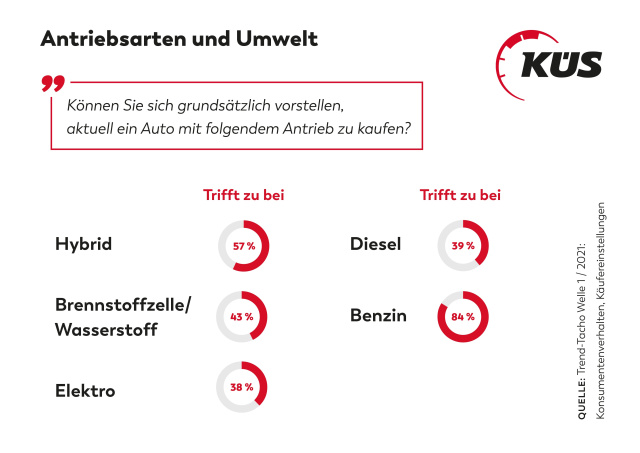 Alternative Antriebe sind in der Gunst der Autofahrer angekommen. Laut der aktuellen Umfrage des KÜS-Trend-Tacho wäre der Hybridmotor eine denkbare Alternative für die Autofahrer, gefolgt von Wasserstoff- und Elektrofahrzeugen. Die Erfahrung mit solchen Fahrzeugen in der Bevölkerung wächst, ihr ökologischer Wert wird wahrgenommen. Der Brennstoffzelle geben die Befragten die größte Chance für die Zukunft.