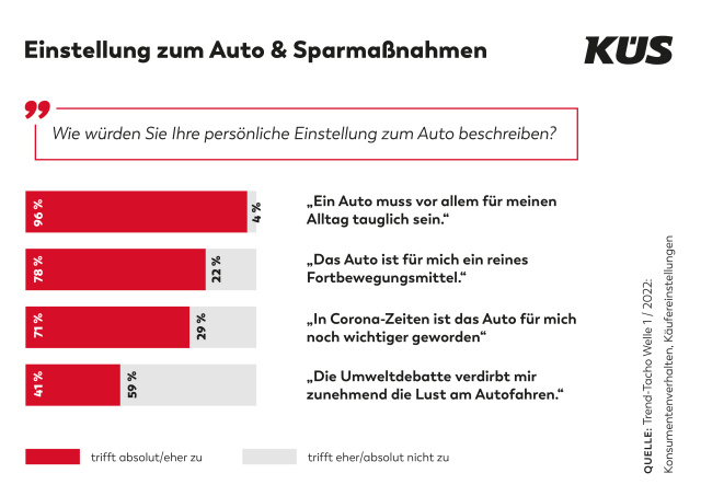 Umweltschutz und Kostenersparnis sind nach wie vor ein Thema. Weniger das Auto nutzen würden der Umwelt zuliebe 44 % und um Kosten zu sparen 61 %, der vielgerühmte E-Antrieb wäre aus Umweltgründen für 29 % ein Thema, aus Kostengründen für 19 %.