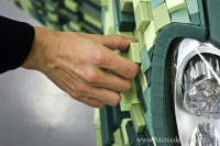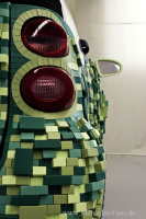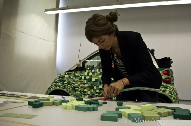 Für die äußere Gestaltung des CARTONDRUCK smart verwendete die mehrfache ADC-Preisträgerin Illenberger ein camouflageartiges Naturmuster mit Namen ECO-FLAGE. Pixelartig auf die Außenhaut des smart aufgebracht, erinnert es an das Muster des Blattwerks eines Busches und betont so mit einem Augenzwinkern die Nachhaltigkeit sowohl des Materials und als auch des smart.