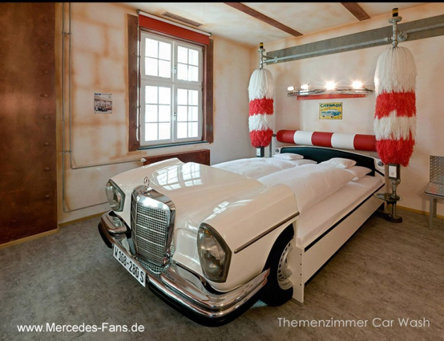 Nur noch sechs Tage bis Heilig Abend und noch immer kein Weihnachtsgeschenk für einen Klassiker orientierten Mercedes-Benz-Fan gefunden? Da haben wir mit dem Geschenkgutschein des V8 Hotels im Meilenwerk Stuttgart vielleicht den rettenden Tipp für Sie. Denn mit dem Gutschein verschenken Sie ein besonderes Erlebnis und eine (vermutlich) unvergessliche Nacht. Denn das V8-Hotel im Meilenwerk Stuttgart hat unter den zehn Themenzimmern eines mit den Namens "Car Wash" im Angebot. Und das Bett in der Waschstraße ist ein Mercedes 280 S (W108). Klingt Oberklasse? Dieses wie alle übrigen Themenzimmer wie z.B. Tankstelle oder Autokino sind mit so viel Charme und Liebe zum Detail eingerichtet, dass man als Autofan die Nacht über am liebsten wach bleiben möchte, um jeden Moment zu genießen. Die Übernachtung in einem Themenzimmer