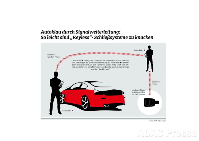 bei den Komfort-Schlüsseln erleichtert Dieben das Handwerk ungemein: Sie müssen sich nur mit einem kleinen Empfänger in die Nähe des Autoschlüssels begeben - und mit einem kleinen Sender in die Nähe der Autotür. Schon werden die Signale hunderte von Metern „verlängert“ und das Auto lässt sich öffnen und wegfahren – auch wenn der Schlüssel im Haus liegt oder der Besitzer mit dem Schlüssel in der Hosentasche im Biergarten sitzt. Nach Ansicht der ADAC-Experten kann die Technik der beiden Geräte mit relativ geringem Aufwand gebaut werden. Das Tückische an diesem Trick: Läuft der Motor einmal, bleibt er auch ohne Schlüssel so lange in Betrieb, wie Sprit im Tank ist. Tankt ein Dieb dann noch bei laufendem Motor nach, kann er das gestohlene Auto problemlos auch weite Strecken entführen.