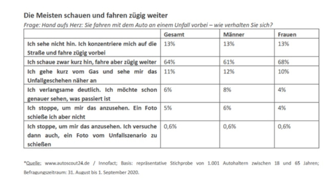 Gaffen ist ein NoGo. Das sollte eigentlich jeder wissen und seine Neugier im Fall des Falles bändigen. Die Realität ist aber eine andere, wie eine aktuelle Umfrage von AutoScout24 zeigt. Demnach sind Schaulustige bei einem Unfall keine Seltenheit, Aus einer Umfrage unter 1.001 AutohalterInnen zu dem Thema geht hervor, dass sich nur drei von vier FahrerInnen angemessen verhalten. Jede/r vierte FahrerIn bekommt die eigene Neugier hingegen nicht unter Kontrolle, falls ein Unfallgeschehen in Sichtweite kommt. Dann geht Mann/Frau vom Gas beziehungsweise bremst ab, um sich das Unfallgeschehen näher anzusehen. Noch rigoroser verhalten sich einige Unverbesserliche: Sie stoppen das eigene Fahrzeug, um sich ausgiebig umzusehen; eine Minderheit versucht sogar, ein Foto vom Unfall zu machen. das freilich kann sie sehr teuer zu stehen kommen: Fertigen Schaulustige Videos oder Fotos von hilflosen Unfallopfern an, machen sie sich nämlich strafbar. Nach Paragraf 201a des StGB drohen bis zu zwei Jahre Haft. Übrigens ist dabei nicht entscheidend, ob dieses Material online gestellt oder auf andere Weise verbreitet wird. Polizeibeamte dürfen in einem solchen Fall auch unmittelbar die Handys der Gaffer einziehen. (Tabelle: AutoScout24 / Bild: "obs/Deutscher Verkehrssicherheitsrat e.V./AdobeStock"