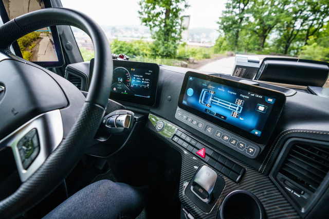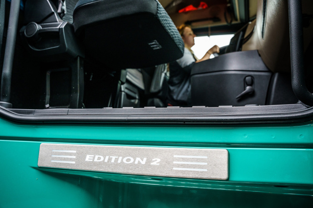Entsprechend groß ist die Freude bei Fahrerin Luisa Kettling, die den Actros selbst aus dem Werk Wörth abholen konnte: „Die Edition 2 ist einfach ein extrem schöner Arbeitsplatz.“ Zu den Sonderumfängen gehören Armaturenbrett und Türgriffe in Nappaleder, Carbonoptik für diverse Teile oder auch die Dachluke mit Ambientebeleuchtung. Angepasst wurde sogar das Startmenü im Display des Multimedia Cockpits, auf der Beifahrerseite ziert der Schriftzug „Edition 2“ auf gebürstetem Aluminium die Brüstung.