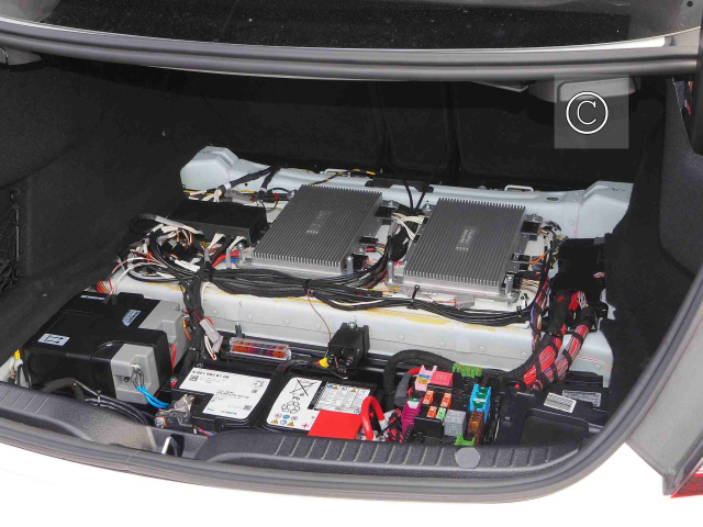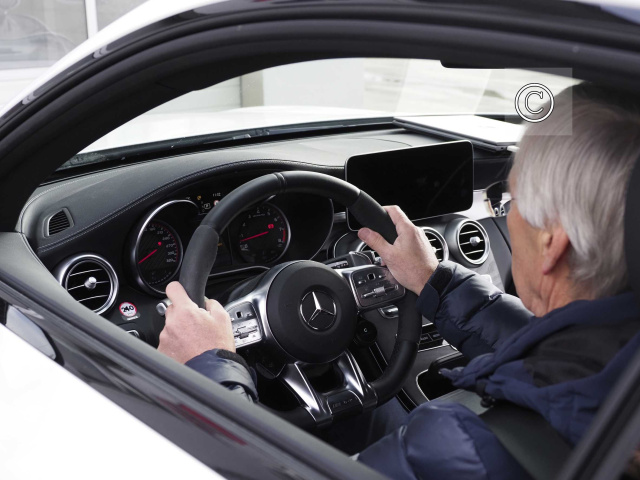 Der weiße Mercedes-AMG C63 gibt sich zunächst völlig unauffällig. Dabei ist hier vieles anders. Erster Hinweis: Das Lenkrad lässt sich nicht verstellen. Aber man kann ja den Sitz etwas in Richtung Lenkrad verschieben. Spätestens beim Blick in den Kofferraum wird dann aber klar: Hier handelt es sich um keinen normalen C63. Im Gepäckabteil sitzen zwei Steuergeräte, eines für den Lenk-Aktuator und eines für den Feedback-Aktuator. Dazu kommt eine zweite Batterie für das Bordnetz, ein Spannungswandler für die Versuchsfahrten und schließlich ein Datenaufzeichnungsgerät. Hinten fährt der C63 also einen Elektronik-Baukasten spazieren, vorn fehlt ihm dafür die Lenksäule. Die Lenkbefehle werden elektronisch über einen Aktuator am Lenkgetriebe übertragen.