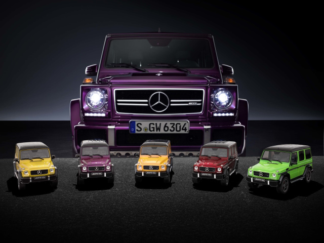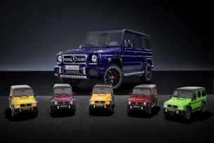 Der Name ist Programm: „Crazy Colors“ heißt eine besondere Farboption für die Modellautos der G-Klasse. Wer seinen Mercedes-AMG G 63 individueller gestalten möchte, kann dabei zwischen fünf exklusiven Exterieur-Lackierungen wählen. Eine bunte Mischung: sunsetbeam erinnert beispielsweise an einen Sonnenuntergang, und bei galacticbeam changieren je nach Lichteinfall verschiedene Blautöne. Anbauteile wie Außenspiegel, Stoßfänger vorne und hinten, Radlaufverbreiterungen, der Ring der Reserveradabdeckung sowie das Dach sind hingegen obsidianschwarz lackiert.