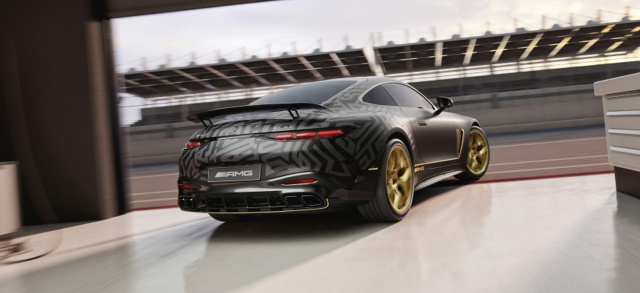 Die „APXGP Edition“ des AMG GT 63 präsentiert sich mit zahlreichen Anlehnungen an das fiktive Formel-1-Team APXGP. Dazu zählen racegoldfarbene Akzente an Kühlergrill, Kotflügeln, Seitenschwellern und Diffusor sowie 21-Zoll-Schmiederäder im Kreuzspeichen-Design in mattem Racegold. Ergänzt wird der Look durch Karbonelemente wie Frontsplitter, Heckflügel und Diffusor sowie das AMG Night-Paket II mit schwarzem Chromdekor.