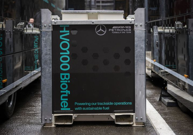 Das Team nutzte während der gesamten Europa-Saison 2024 HVO100 , die in den motorisierten Fahrzeugen und unterstützenden Geräten eingesetzt wurden. Diese Kraftstoffe stammen aus erneuerbaren Quellen und sind wesentlich umweltfreundlicher als herkömmliche fossile Kraftstoffe. Sie tragen somit dazu bei, den CO₂-Fußabdruck zu verringern, indem sie bis zu 90% weniger klimaschädliche Emissionen freisetzen. Durch die Implementierung von Biokraftstoffen der zweiten Generation konnte das Mercedes-AMG PETRONAS F1 Team beachtliche 500 Tonnen CO₂ einsparen.