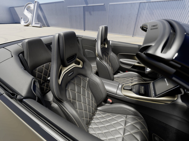 Im Inneren setzen die AMG Performance Sitze aus edlem Nappa-Leder in Schwarz mit Rautensteppung und goldenen Ziernähten neue Maßstäbe in Sachen Komfort und Stil. Die Multikontursitzfunktion und Sitzklimatisierung sorgen für höchsten Langstreckenkomfort. Auch das AMG Performance Lenkrad aus Nappa-Leder, die hochflorigen Fußmatten mit AMG Logo sowie die exklusiven Zierteile in MANUFAKTUR kalaharigold magno in den Vordersitz-Rückenlehnen spiegeln die erlesene Handwerkskunst wider. Den krönenden Abschluss bildet die „MANUFAKTUR Golden Coast“-Editionsplakette in der Mittelkonsole, die jedes der 100 Fahrzeuge als einzigartiges Kunstwerk auszeichnet.