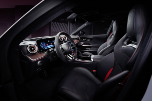 Im Innenraum erfreut ein Kontrast aus Schwarz und Rot das Auge des Betrachters. So sind beispielsweise die AMG Performance Sitze mit schwarzen Nappalederpolstern, roten Ziernähten und geprägten AMG Wappen in den vorderen Kopfstützen ausstaffiert. Ferner befinden sich rote Sicherheitsgurte, AMG Einstiegsleisten mit rot beleuchtetem „AMG“ Schriftzug, AMG Zierelemente Carbon mit rotem Faden und ein AMG Performance Lenkrad in Leder Nappa / Mikrofaser DINAMICA mit roter Ziernaht an Bord.