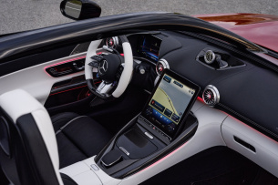 Das Innenraumdesign kann mit einem eleganten, kontrastreichen Farb- und Materialkonzept in Kristallweiß und Schwarz beeindrucken. Die AMG Performance-Sitze mit exklusivem Lederbezug und markanten Ziernähten sehen gut aus und versprechen optimalem Seitenhalt. Hinter den Sitzen setzt eine Carbonverkleidung Akzente, während eingearbeitete Leder-Pads die geschwungenen Linien der Sitze fortführen. Hochflorige AMG-Fußmatten greifen die Farbgebung, das Design und die Ziernähte der Sitze erneut auf. Ebenso sind die Türschwellerverkleidungen stilvoll mit Leder überzogen. Das AMG Performance-Lenkrad setzt die zweifarbige Gestaltung des Innenraums nahtlos fort.