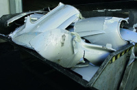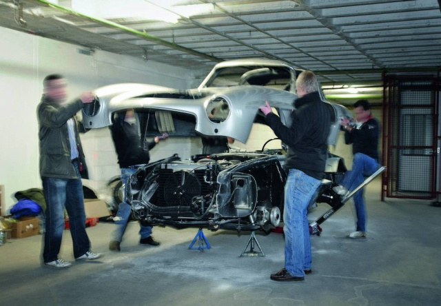 Mercedes-Benz 300 SL im hauseigenen MB Gebrauchtteile Center vernichtet. Aufgrund der juristischen Lage ist es nicht rechtmäßig, diese Karosserie in den Verkehr zu bringen. Sie war vom deutschen Zoll beschlagnahmt worden. Die Karosserieform des legendären Flügeltürers ist zugunsten der Daimler AG geschützt. Wer Nachbauten des Fahrzeugs herstellt, anbietet oder verkauft, verletzt die Rechte des Unternehmens. Das gilt auch dann, wenn für die Nachbauten keine Wort- oder Bildmarken des Unternehmens verwendet werden. Die Daimler AG geht seit Längerem energisch gegen Nachbauten vor.