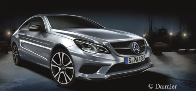 Zu den Ausstattungsdetails des E 350 Coupé zählen ein Heckspoiler, eine Frontschürzenspoilerlippe und ein Dachspoiler, die selbstverständlich in Wagenfarbe lackiert werden können. Das Coupé rollt auf schwarz-glanzgedrehten 5-Doppelspeichen-Leichtmetallrädern im 19-Format. Besondere Akzente setzen die verchromten Türgriffschalen, die schwarzen Außenspiegelgehäuse, die Sportplaketten an den vorderen Kotflügeln und der beim Öffnen der Türen beleuchtete Zentralstern im Kühlergrill.