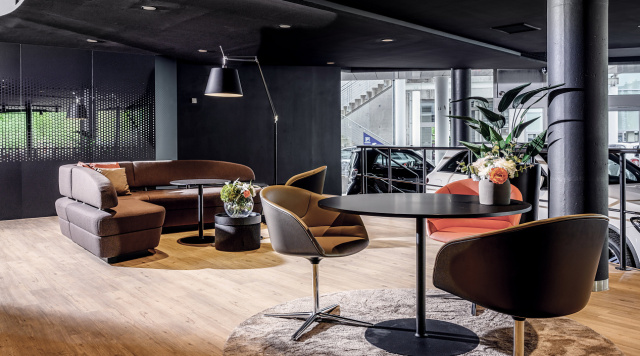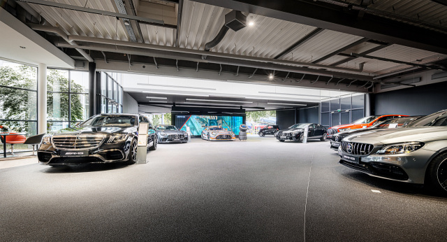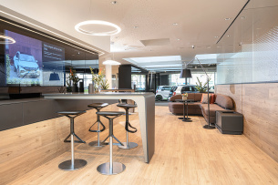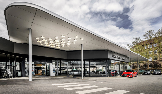 Beim Betreten des modernen Autohauses erwartet die Kunden ein offenes Raumkonzept in neuer Mercedes-Benz Designsprache. Das neue Showroom-Konzept umfasst drei große Videowände mit bis zu 21 Quadratmetern Projektionsfläche sowie vier vollklimatisierte private Beratungsräume mit neuester Medientechnik. Insgesamt wurden 80 Bildschirme mit mindestens 55 Zoll verbaut. Großzügige Loungebereiche sorgen für eine entspannte Wohlfühlatmosphäre. Wer lieber auf persönlichen Kontakt verzichten möchte oder es besonders eilig hat und sein Fahrzeug zum Service abgeben möchte, nutzt ganz einfach die kontaktlose Serviceannahme über die Self Check-in Schalter.