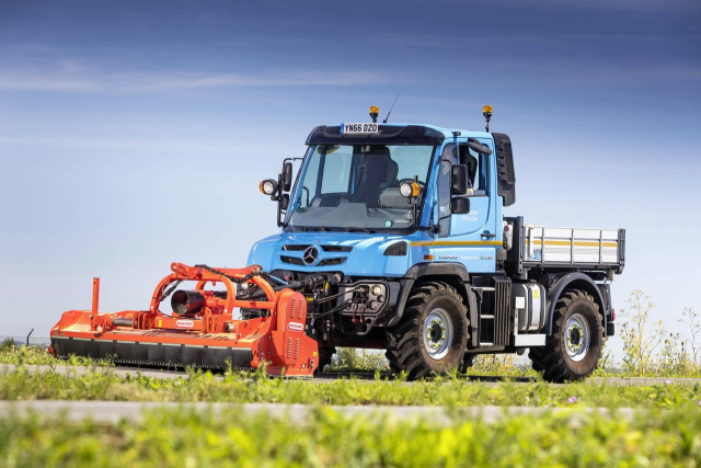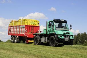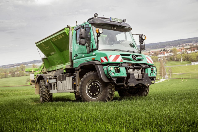 Hohe Auslastung durch Glättebekämpfung im Winter, Reinigungsarbeiten und Gehölzpflege in der Übergangszeit – das ist häufig gelebter Alltag für zahlreiche Lohnunternehmer, die hauptsächlich in der Landwirtschaft tätig sind. Gerade sie wissen die Kernkompetenz des Unimog, nämlich seinen uneingeschränkten Ganzjahreseinsatz, zu schätzen. Für eine Vielfalt von Geräten stehen vier Anbauräume zur Verfügung, zusätzlich zu Front und Heck auch zwischen den Achsen und auf dem Chassis. Dazu kommen die guten Transporteigenschaften des Unimog, sein hohes Gesamtzuggewicht von bis zu 40 Tonnen sowie die uneingeschränkte Autobahntauglichkeit dank einer Höchstgeschwindigkeit von 89 km/h. Der Unimog mit zwei zweiachsigen landwirtschaftlichen Anhängern kann die maximal zugelassene Transportlänge von 18 Metern optimal ausnutzen. Fahrzeuge mit einer Zulassung als Zugmaschine-Ackerschlepper oder als Geräteträger, die zum Transport landwirtschaftlicher Güter oder Arbeiten genutzt werden, können von der Maut-Pflicht für Lkw in Deutschland befreit werden. Je nach Nutzung gilt das auch für den Unimog, ebenso wie eine Befreiung vom Sonntagsfahrverbot auf Autobahnen. Dank der Sicherheitskabine mit Überrollbügel ist der Unimog jetzt auch EU-weit als Traktor zulassungsfähig.