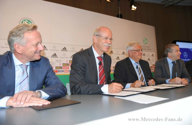 Bereits seit 1972 sind Mercedes-Benz und der Deutsche Fußball-Bund freundschaftlich miteinander verbunden. Konsequente Folge war die Ausweitung der Zusammenarbeit, die am 23. April 1990 besiegelt wurde. Seit diesem Tag tritt Mercedes-Benz als Generalsponsor des DFB in Erscheinung. Die Verbindung zählt heute zu den erfolgreichsten und vertrauensvollsten Partnerschaften im deutschen Sport. "In unseren Nationalmannschaften legen wir großen Wert auf Teamgeist und gegenseitigen Respekt. Die Partnerschaft mit unserem Generalsponsor Mercedes-Benz wird vom gleichen Geist getragen. Wir freuen uns daher sehr, die bewährte Zusammenarbeit weiterhin fortsetzen zu können", sagte Dr. Zwanziger.