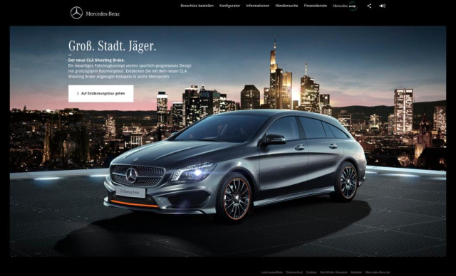 Die digitale Kampagne „Connected City“ zeigt den CLA Shooting Brake als Großstadtjäger über den Dächern der faszinierenden Metropolen Frankfurt, Paris, Barcelona, Mailand, Brüssel und Tokio. Dabei ist er stets am Puls der Stadt und bereit für das nächste Abenteuer. Das Webspecial - bitte HIER KJLICKEN - bietet zwei Ebenen. Ebene eins gibt dem User alle relevanten Informationen zum Fahrzeug. Interessenten können sich mittels einer 360°-Animation rund um das Fahrzeug drehen und mit der Kamera auch einen direkten Blick in das Interieur werfen. Die sechs Metropolen stehen dabei sinnbildlich für verschiedene Aspekte des Fahrzeugs. Frankfurt steht für Vernetzung, Barcelona für das Exterieur-Design, Tokio für Sicherheit, Brüssel für Komfort, Paris für das Innenraum-Design und Mailand für Fahrdynamik. Pro Stadt werden passend zum Themenbereich vier besondere Fahrzeug-Features näher vorgestellt. Auf der zweiten Ebene des Webspecials taucht der Nutzer tiefer in die Metropolen ein und kann bis zu neun angesagte Hotspots je Stadt erleben. Dazu gehören Galerien, Bars, Restaurants, Modetempel oder Concept Stores. Mit einem Klick auf den Hotspot erfährt der Nutzer wie in einem Szene-Magazin Wissenswertes und erhält die jeweiligen Adressen und Kontaktdaten. Die nationalen Hotspots können außerdem von den Märkten als Probefahrt- oder Eventlocations zur Vermarktung des Fahrzeugs genutzt werden.