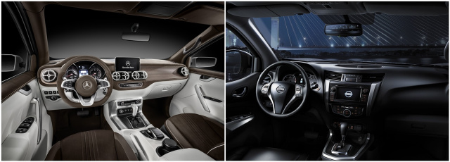 auszeichnet“, sagte Volker Mornhinweg, Leiter Mercedes-Benz Vans bei der Premiere des Concept X-Class Pickup. Im Windschatten des Navara wollen die Stuttgarter gewiss nicht den Pickup-Markt aufmischen. Die X-Klasse will vorfahren. Helfen soll dabei auch ein - wie man bei der Concept-X-Class-Premiere verkündete - attraktiver Verkaufspreis. Bei Nissan liegt der Einstiegspreis für einen Navara mit Doppelkabine und Allradantrieb bei 28.7000 €. Dafür gibt‘s die Navara-Variante Visia mit 2,3 Liter dCi und Sechsgang-Schaltgetriebe. Die Ausstattung der Arbeitsbiene Visia ist allerdings eher karg und puristisch. Großartige Komfortausstattung und Assistenzsysteme sind hier nicht an Bord. Das Interieur des Navara generell wirkt eher spröde. Gediegener Pkw-Standard erwartet den Navara-Fahrer. Begeisterung für innere Werte wird hier nicht so schnell geweckt. Da wird die X-Klasse einiges mehr zu bieten haben. Mehr Style. Mehr Modernität. Mehr Komfort. Mehr Assistenz. Mehr Wohlfühlerlebnis und eine hochwertige Materialanmutung. Typisch Premium eben.