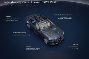 Die vier Kernbereiche der redundanten Architektur umfassen das Bremssystem, die Lenkung, die Stromversorgung sowie Teile der Sensorik. Dies beinhaltet damit die Umfelderkennung sowie die Fahrdynamik. Batterie, Lenkmotor, Raddrehzahlsensorik bis hin zu Algorithmen, die das System für die Datenberechnung nutzt, sind ebenfalls doppelt ausgelegt. Darüber hinaus sind Teile der Sensorik funktional redundant, da sie sich durch ihre unterschiedlichen physikalischen Konzepte (u.a. Optik; Ultraschall; Radiowellen) gegenseitig bestätigen und so stets ein sicherer Betrieb ermöglicht wird. Dazu gehören hauptsächlich Radare, Kameras und ein LiDAR, aber auch Ultraschall- und Nässesensoren sowie Mikrofone liefern wertvolle Daten. Insgesamt sorgen über 30 Sensoren dafür, dass DRIVE PILOT zuverlässig die Fahraufgabe meistert.