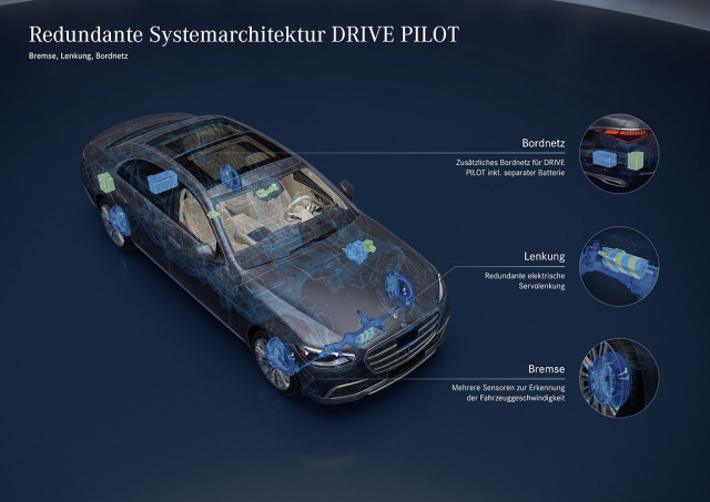 Mercedes-Benz fokussiert sich beim hochautomatisierten Fahren (SAE-Level 3) auf Sicherheit und Zuverlässigkeit. DRIVE PILOT baut daher auf eine Systemarchitektur, die es jederzeit ermöglicht, alle potentiell auftretenden Situationen sicher zu beherrschen. Bremsen, Lenkung, Stromversorgung sowie Teile der Sensorik sind dafür physisch sowie funktional redundant konzipiert. Mit dieser sicherheitsfokussierten Systemauslegung setzt Mercedes-Benz gänzlich neue Maßstäbe beim automatisieren Fahren. DRIVE PILOT ist als weltweit erstes international zertifiziertes System seit dem 17. Mai 2022 als Sonderausstattung in S‑Klasse und EQS in Deutschland erhältlich.