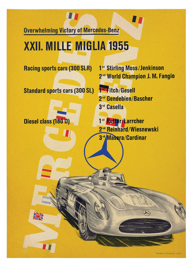 Im glorreichen Jahr 1955 gewinnt der junge Stirling Brite Moss dieses furiose italienische Straßenrennen mit seinem Beifahrer Denis Jenkinson in der besten je erreichten Zeit von 10 Stunden, 7 Minuten und 48 Sekunden für rund 1.600 Kilometer. Zweiter wurde im Jahr 1955 Juan Manuel Fangio. Zudem belegte der Mercedes-Benz 300 SL in der Klasse der "Standard Sports Cars" die Plätze eins bis drei, sowie der Mercedes-Benz 180 D in der "Diesel Class" ebenfalls die Plätze eins bis drei.