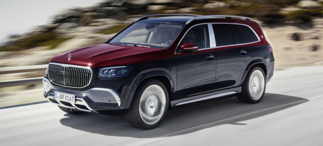 Der Mercedes-Benz Stern thront klassisch auf der Motorhaube, die feinen vertikalen Chromstreben des Maybach Kühlergrills wirken wie Nadelstreifen. Wirkungsvolle Chromakzente um die Seitenscheiben und die Chromeinleger in den Seitenschwellern lassen das Profil edel und elegant wirken. Die 22 oder 23 Zoll großen Räder wurden exklusiv für dieses Modell entworfen, die 23-Zoll-Ausführung zitiert das Nadelstreifen-Motiv. Die Endrohrblenden mit kleinem Quersteg betonen die Mercedes-Maybach Identität. Gleiches gilt auch für das Markenemblem, das an verschiedenen Stellen wie der D-Säule platziert wurde. Als Maybach-spezifische Besonderheit ist eine Zweifarblackierung in acht verschiedenen, eleganten Farbkombinationen erhältlich.