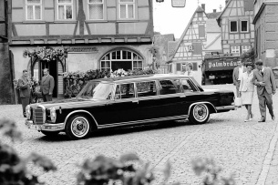 10 – Serie: Die Erfolgsstory der Pullman-Versionen von luxuriösen Mercedes-Benz Personenwagen lässt sich an den Repräsentationsfahrzeugen Mitte des 20. Jahrhunderts ablesen: Vom Mercedes-Benz 300 (W 189) entstehen 1960 noch lediglich drei Einzelstücke. Der Mercedes-Benz 600 (W 100) dagegen ist von 1963 bis 1981 serienmäßig als Pullman-Limousine und Pullman-Landaulet mit vier oder sechs Türen erhältlich. Individualisierung ist dabei Programm: Für Beatle John Lennon baut Mercedes-Benz nicht nur die Fondsitze in Längsrichtung ein, sondern installiert auch eine der besten Hi-Fi-Anlagen für Automobile, die damals zu haben ist – für Reise-Sound auf Pullman-Niveau.