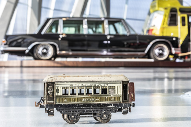 1 – Name: „Pullman“ heißen ursprünglich vor mehr als 100 Jahren die komfortablen und luxuriösen Schlaf- und Salonwagen der Eisenbahn. Entwickelt hat sie in den 1860er-Jahren der amerikanische Ingenieur und Unternehmer George Mortimer Pullman (1831 bis 1897). Genauso exklusiv wollen anspruchsvollste Kunden später auch im Automobil reisen. Klar, dass der Begriff „Pullman“ auf das Auto übertragen wird – das passiert im frühen 20. Jahrhundert. An diesen Ursprung erinnert im Mercedes-Benz Museum der Modellbahnwaggon einer Tinplate-Spielzeugeisenbahn vor der hochexklusiven Mercedes-Benz 600 Pullman Staatslimousine (W 100) aus dem Jahr 1965 im Raum „Collection 4: Galerie der Namen“.