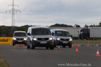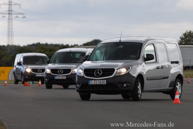 Derartig wachgerüttelt, hatten die Mercedes-Benz Kunden sodann Gelegenheit zu verschiedenen Selbst-Fahr-Stationen, zum Beispiel zu den Transportern. Mit den kompakten Vans wie dem brandneuen Mercedes-Benz Citan oder dem bewährten Vito konnten sich Kunden und Interessierte auf einem anspruchsvoll abgesteckten Handlingkurs an den Grenzbereich der Premium-Transporter herantasten. Professionellen Demo-Instruktoren blieb es vorbehalten, mit einem speziell ausgerüsteten Mercedes-Benz Sprinter über den Grenzbereich hinaus zu gehen: Stützräder an der Fahrzeugflanke verhinderten, dass der mit hoher Last beladene Großraum-Van sich bei flotter Kurvenfahrt auf die Seite legte.