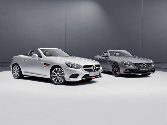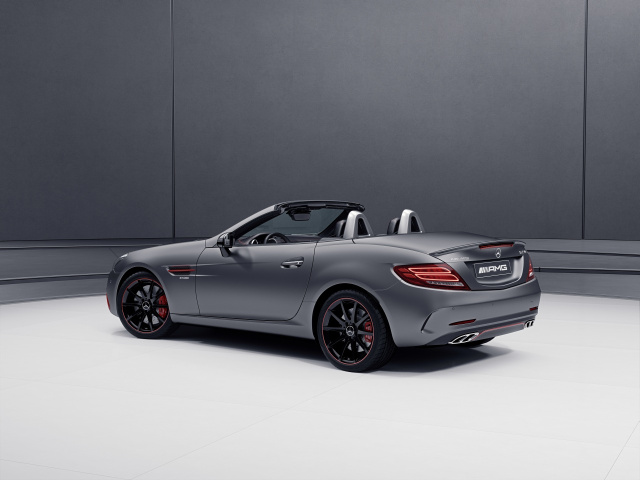 Ob mit Einstiegsmotor, Diesel-Antrieb oder als Mercedes-AMG Topmodell: Der SLC lässt sich in allen fünf Motorsierungen als besonders dynamische RedArt Edition bestellen. Die Vierzylindermodelle SLC 180, SLC 200, SLC 250 d und SLC 300 stehen im exklusiven Mattlack designo iridiumsilber magno parat. Kunden können alternativ zwischen sechs weiteren Farbtönen auswählen. Mit einem aufregenden Design und markanten Details präsentiert sich die RedArt Edition besonders sportlich. Unterstrichen wird das durch die roten Farbakzente im Exterieur und Interieur. Der rote Frontsplitter, der Diamantgrill im exklusiven Design mit Pins in rot und schwarz, rote Finnen in den Kotflügeln mit exklusiver Edition-Badge und der Diffusor mit roter Zierleiste verleihen dem SLC RedArt Edition einen prägnanten Look. Einen stimmigen Kontrast bilden die markanten, 45,7 cm (18") großen Leichtmetallräder im 5-Doppelspeichen-Design, tremolit-metallic lackiert und glanzgedreht. Größere, gelochte Bremsscheiben und rote Bremssättel mit Mercedes-Benz Schriftzug vorne steigern zudem die Performance des SLC.