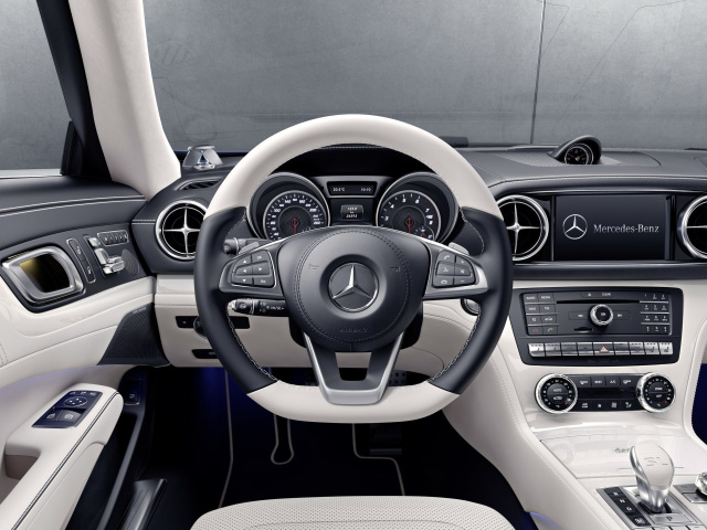 Fahrer und Beifahrer erleben den außergewöhnlichen Charakter des SL designo Edition mit exklusiven Designelementen und hochwertigen Materialien im Interieur. Sitze und Türmittelfelder in designo Leder Nappa porzellan/schwarz mit exklusiver designo-Grafik, der Innenhimmel in designo DINAMICA porzellan und designo Gurte in weiß sorgen für ein besonders edles Ambiente. Dazu passen weitere Ausstattungsumfänge wie die Ambientebeleuchtung, das zweifarbige Multifunktions-Sportlenkrad im Dreispeichen-Design in Leder Nappa schwarz/porzellan, der DIRECT SELECT Wählhebel in Leder porzellan, das designo Zierelement in Klavierlack champagnerweiß sowie die Fußmatten mit designo Plakette und Paspel in porzellan.