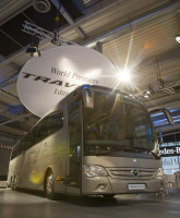 Mercedes-Benz Citaro, der als erster Niederflurbus mit dem elektronischen Stabilitätsprogramm ESP lieferbar ist. Aber nicht nur im Stadtbusbereich gab es Neuheiten, auch im Reisebusprogramm gab es den zukünftigen Antrieb zu sehen. So fährt das Flaggschiff im Mercedes-Benz Produktprogramm, der Travego Edition 1 mit Euro VI Antrieb vor. Mit neuem BlueEfficiency Power-Motor, neuem Getriebe und der Einstufung nach Euro VI gibt der neue Travego Edition 1 einen Ausblick in die Zukunft des Antriebs.
