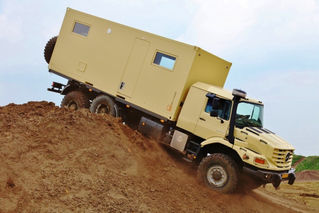 Der Mercedes-Benz Zetros 6x6 mit Bliss-Expeditionsaufbau verfügt über einen 20ft-Aufbau und hat damit genau die gleichen Abmessungen wie ein Frachtcontainer und kann genauso transportiert und versendet werden. Mit einem Gewicht von 4200 kg und einer Länge von 6,10 m ist er der optimale Aufbau für den Zetros 6x6 und damit ideal für 4 Personen. Das Expeditionsmobil verfügt über die komplette Ausstattung für unabhängiges, weltweites Reisen. 565 l Frischwasser werden in zwei unabhängigen Tanks gelagert. 6 Solarmodule leisten insgesamt ca. 1650 kW. Klimaanlage, Heizung, und viele andere Komponenten bieten viel Komfort für luxuriöses Reisen für ca. 90 Reisetage. Zusatztanks am Fahrgestell bringen eine Reichweite von ca. 2.500 km. Der hochgeländegängige Zetros 2733 6x6 als Extremwohnmobil kombiniert die extreme Geländegängigkeit eines Unimog mit der Tragfähigkeit eines schweren Lkw. Der Zetros ist ein sehr robuster, hochgeländegängiger Lkw. Auf Grund der Konzeption als Haubenfahrzeug und der Sitzposition des Fahrers hinter der Vorderachse hat der Zetros ein besonders sicheres und komfortables Fahrverhalten, gerade auf schlechten Wegen und im Gelände. Der Zetros nutzt Aggregate und Komponenten aus der Lkw-Großserie, die im Bedarfsfall über den Mercedes-Benz Service auch in entlegenen Regionen der Erde kurzfristig verfügbar sind. Der Zetros ist damit der ideale Begleiter für sicheres Reisen gerade zu Zielen, wo keine Straßen und Wege hinführen. Der permanente Allradantrieb, zweistufiges Verteilergetriebe, Differentialsperren und eine hohe Verwindungsfähigkeit des Fahrgestells sorgen für ein Höchstmaß an Traktion. Im Unterschied zu vielen Reisemobilen kennt der zweiachsige Zetros 1833 4x4 mit 18 t zulässigem Gesamtgewicht bzw. der dreiachsige 2733 6x6 mit 27 t zulässigem Gesamtgewicht keine Nutzlastprobleme. Den Antrieb übernimmt ein Reihensechszylinder mit 7,2 l Hubraum und 240 kW/ 326 PS Leistung in Kombination mit einem optionalen Sechsgang-Automatikgetriebe. Die maximale Achsverschränkung beträgt 2 x 500 mm, die Watfähigkeit bis zu 1190 mm und die Steigfähigkeit 80 Prozent.