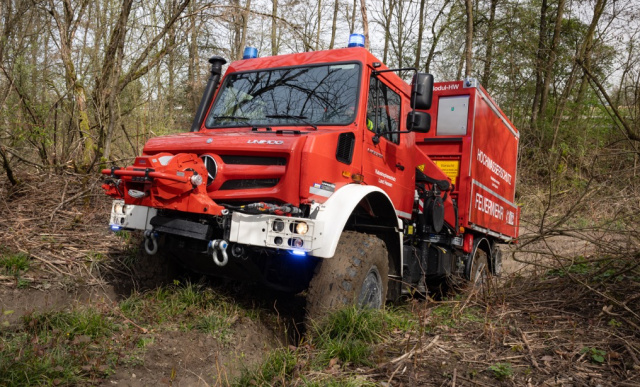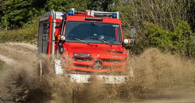 Der hochgeländegängige Unimog U 5023 bietet eine Reihe von technischen Eigenschaften, mit denen er für Einsätze in unwegsamem Gelände und speziell für die Waldbrandbekämpfung gerüstet ist. Mit der hohen Bodenfreiheit von 50 Zentimeter kann der Unimog selbst im extremen Gelände viele Hindernisse überfahren und durch die großen Rampen- und Böschungswinkel auch steile Hänge erklimmen. Die Kombination aus spezieller Geländebereifung und integrierter Reifendruckregelanlage, durch die eine schnelle Anpassung des Reifendrucks während der Fahrt möglich ist, sorgt dabei für Traktion auf verschiedenen Untergründen. Die sogenannte Watfähigkeit von bis zu 1,2 Meter als Sonderausstattung erlaubt es der Besatzung beispielsweise Flüsse zu durchfahren oder ihr Fahrzeug in Überschwemmungsgebieten einzusetzen. Der Unimog ist zudem mit einem Hitzeschutz an allen betriebs-relevanten Leitungen ausgestattet, was die Sicherheit der Einsatzkräfte und die Zuverlässigkeit des Fahrzeugs in hitzeintensiven Umgebungen steigert.