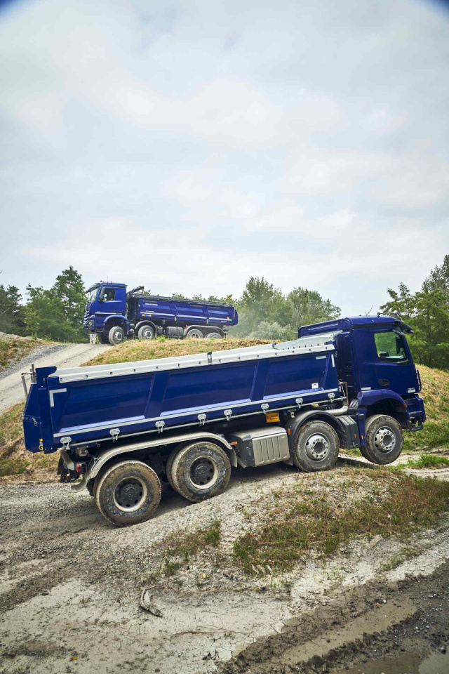 Die Arocs-Baureihe wurde für härteste Anforderungen im Materialtransport, Tiefbau und im Offroad-Bereich entwickelt. Ihr verwindungsfähiges Rahmenkonzept ermöglicht hohe Zuladungen und vielfältige Aufbauten. Dank eines breiten Radformelangebots (4x2 bis 8x8) und leistungsstarker Euro-VI-Motoren (OM 470, OM 471, OM 473 mit bis zu 460 kW) bietet der Arocs maximale Anpassungsfähigkeit. Unterstützt wird dies durch Technologien wie das Automatikgetriebe Powershift Advanced, den zuschaltbaren Hydraulic Auxiliary Drive (HAD) für zusätzliche Traktion sowie die verschleißfreie Turbo-Retarder-Kupplung. Moderne Assistenzsysteme wie der Active Brake Assist 6, Active Sideguard Assist 2 und LED-Scheinwerfer mit optionalem Steinschlagschutz sorgen für hohe Sicherheit auf und abseits der Straße. Zusätzlich steigert das digitale Cockpit „Multimedia Cockpit Interactive 2“ mit TruckLive die Effizienz und Konnektivität im Flotteneinsatz.