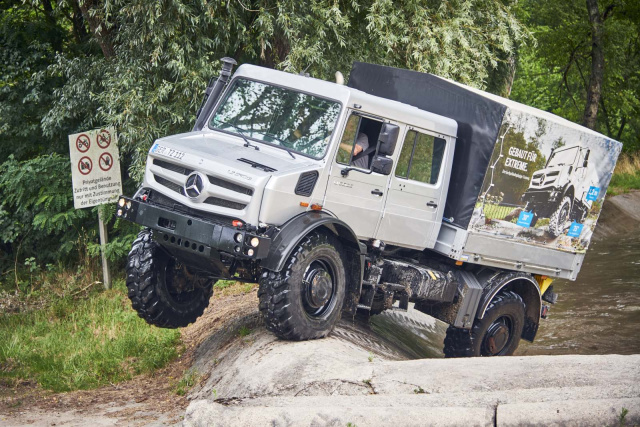 Ergänzt wird das Angebot durch den geländegängigen Unimog U 5023 Doppelkabine, der für besonders schwierige Einsätze ausgelegt ist. Mit Portalachsen, Allradantrieb, hoher Wattiefe und Platz für bis zu sieben Personen ist er insbesondere für Feuerwehr, Katastrophenschutz und Baustellen im Gelände geeignet.