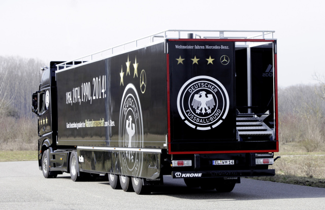 Das aus einem obsidianschwarzen Mercedes-Benz Actros 1863 LS und einem speziell von Krone umgebauten Auflieger bestehende Gespann diente als rollende Bühne, auf der die erfolgreiche Mannschaft den Fans den Weltpokal präsentierte. In der Rekordzeit von nur vier Tagen gelang es dem Krone-Team, das Korsofahrzeug für die Weltmeisterschaftsfeier zu fertigen. Die Spezialisten entfernten zunächst einmal das Dach eines Kühlsattelaufliegers in der laufenden Produktion, bauten einen neuen tragfähigen Zwischenboden ein und montierten ein Geländer, das den Fußballern sicheren Halt bot. Anschließend wurde der Open-Air-Auflieger ansprechend verkleidet und lackiert.