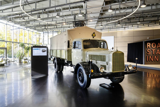 Die History Wall führt von dort über eine Strecke von 20 Metern bis zum Restaurant – ein chronologischer Rundgang durch die Firmengeschichte mit spannenden Geschichten aus der Gegenwart bis in die Vergangenheit zum ersten Daimler Truck 1896.