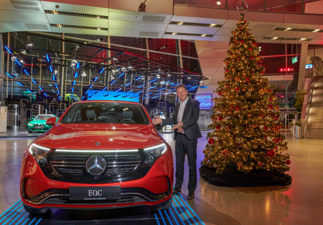 Bild oben: Helmut Käs, Leiter BMW Welt, präsentiert den Mercedes EQC