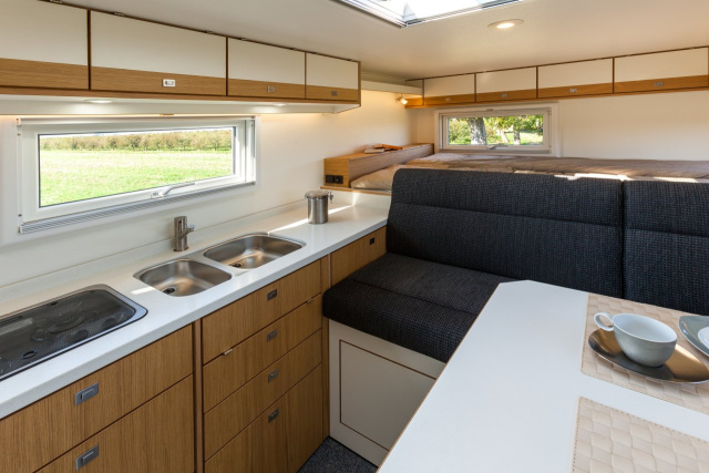 Rechts neben der Einstiegstür zum Wohnbereich birgt ein deckenhoher Stauschrank unter anderem den 85 Liter fassenden Kompressor-Kühlschrank. Gegenüber ist das Sanitärabteil mit Dusche, Waschbecken und Kassetten-WC untergebracht. Die Kontrollinstrumente und Bedieneinheiten der Bordtechnik hat Bocklet über dem Durchstieg zum Fahrerhaus installiert. Auf der Fahrerseite bietet die Sitzgruppe Platz für eine gemütliche Runde. Gegenüber liegt die Küchenzeile mit Doppelspüle, zweiflammigem Kocher und reichlich Staumöglichkeiten. Die finden sich auch, von außen zugänglich, über die gesamte Fahrzeugbreite unter dem 200 x 135 cm großen Doppelbett im Heck. Rundum laufende Deckenschränke nehmen weitere Utensilien auf, die man auf Reisen gerne bei sich hat.