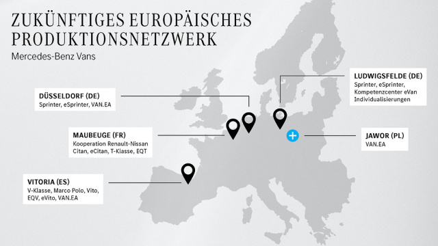 Mercedes-Benz Vans ordnet sein europäisches Produktionsnetzwerk neu. Damit macht die Van-Sparte einen weiteren Schritt hin zum Anbieter lokal emissionsfreier Mobilität. Standort Jawor/Polen soll neues Mitglied im Van-Produktionsnetzwerk werden. Das Werk produziert bislang Vierzylinder-Benzin- und Dieselmotoren sowie Elektrobatterien für Mercedes-Benz-Personenwagen.